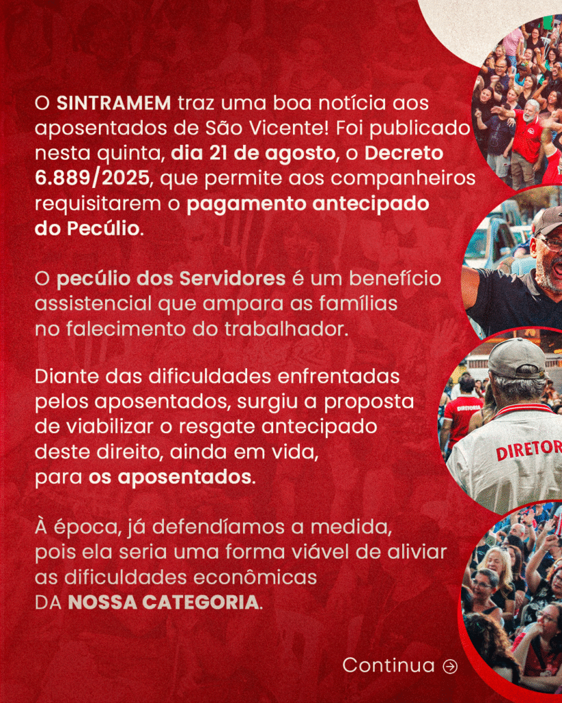 O SINTRAMEM traz uma boa notícia aos aposentados de São Vicente! Foi publicado nesta quinta, dia 21 de agosto, o Decreto nº 6.889/2025, que permite aos companheiros requisitarem o pagamento antecipado do Pecúlio. O pecúlio dos Servidores é um benefício assistencial que ampara as famílias no falecimento do trabalhador e esteve no centro de muitos debates nos últimos meses.