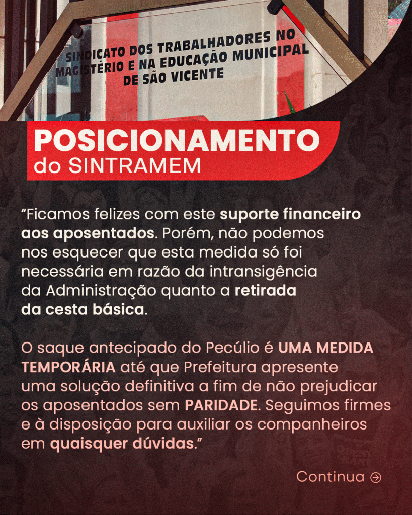 O saque antecipado do Pecúlio é UMA MEDIDA TEMPORÁRIA até que Prefeitura apresente uma solução definitiva a fim de não prejudicar os aposentados sem PARIDADE. Seguimos firmes na defesa da categoria e à disposição para auxiliar os companheiros e esclarecer quaisquer dúvidas.”