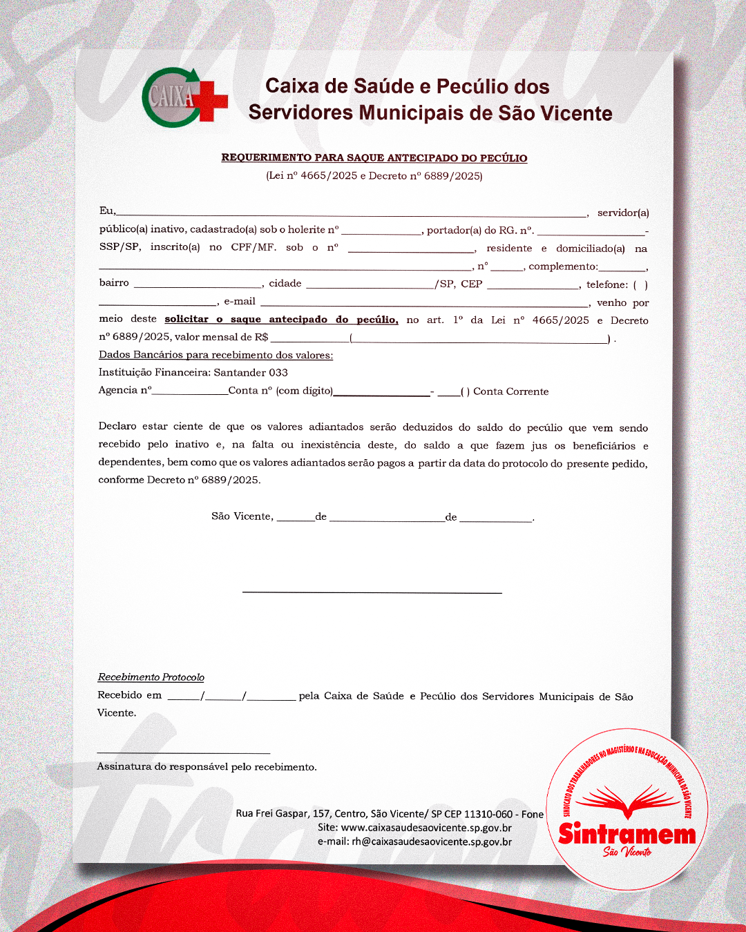 O valor do pecúlio, em caso de falecimento do Servidor, é de aproximadamente R$ 55.000,00 (cinquenta e cinco mil reais). Já o saque antecipado será realizado da seguinte forma: 12 parcelas de R$ 400,00. Todos os aposentados que quiserem solicitar o adiantamento devem comparecer à sede do Sindicato dos Servidores Públicos Municipais de São Vicente (SindServSV), na rua Visconde de Tamandaré, 234, Centro.
