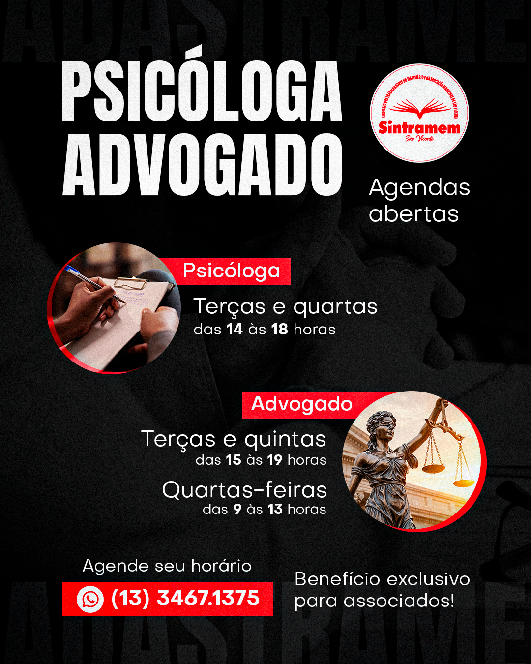 Confira os dias de atendimento psicológico e jurídico na sede do Sindicato. Faça já seu agendamento!