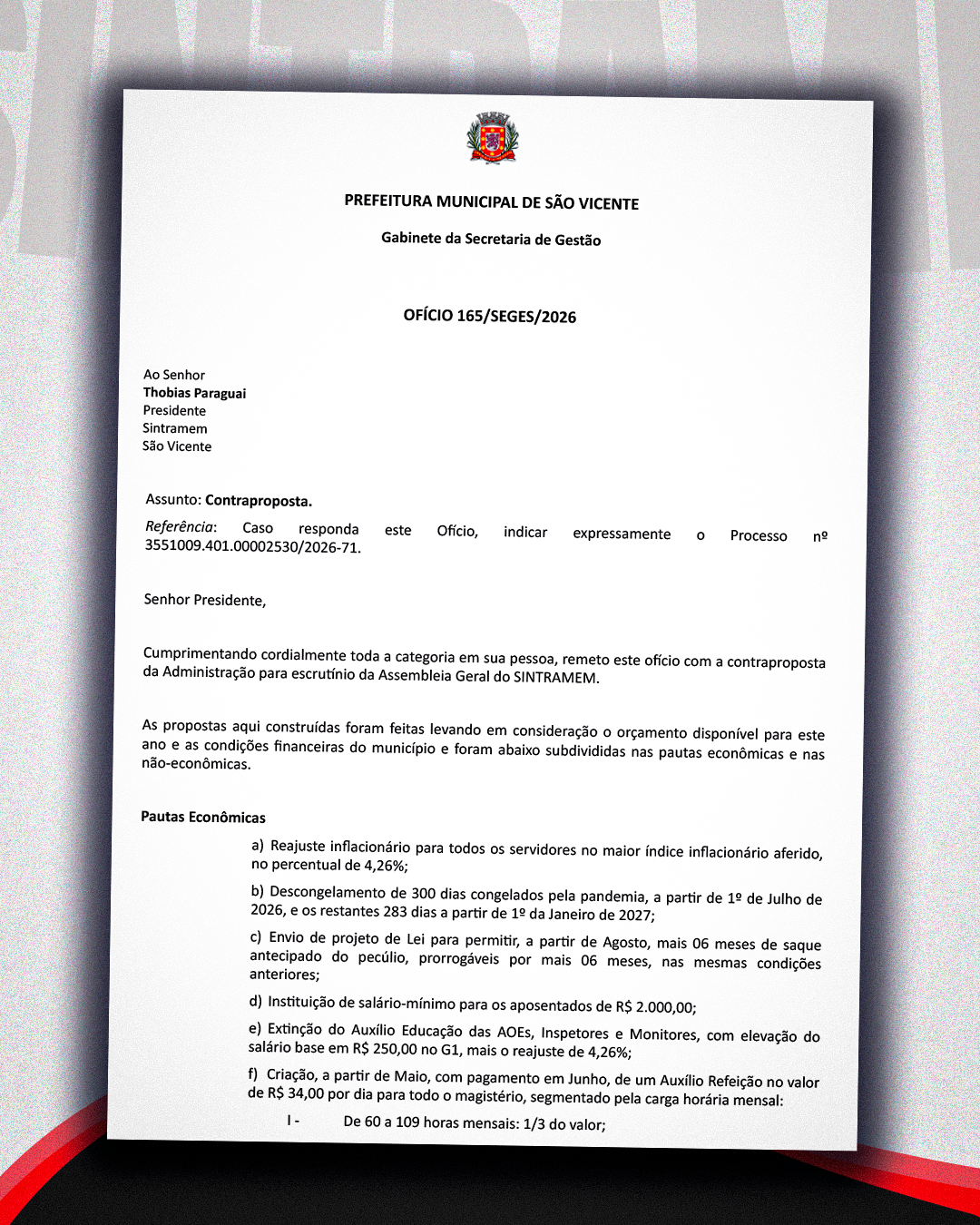 Após intensas negociações com o SINTRAMEM, a Prefeitura entregou oficialmente uma contraproposta para a Campanha Salarial 2026. O documento, assinado pelo secretário municipal de Gestão, Yuri Camara Batista, chegou ao Sindicato com medidas que impactam diretamente os salários, benefícios e condições de trabalho dos Servidores da Educação. Agora, a palavra final será da categoria, em assembleia geral convocada para esta sexta-feira, dia 13 de março, na sede do SindiservSV, localizada na Rua Visconde de Tamandaré, 234, Centro.