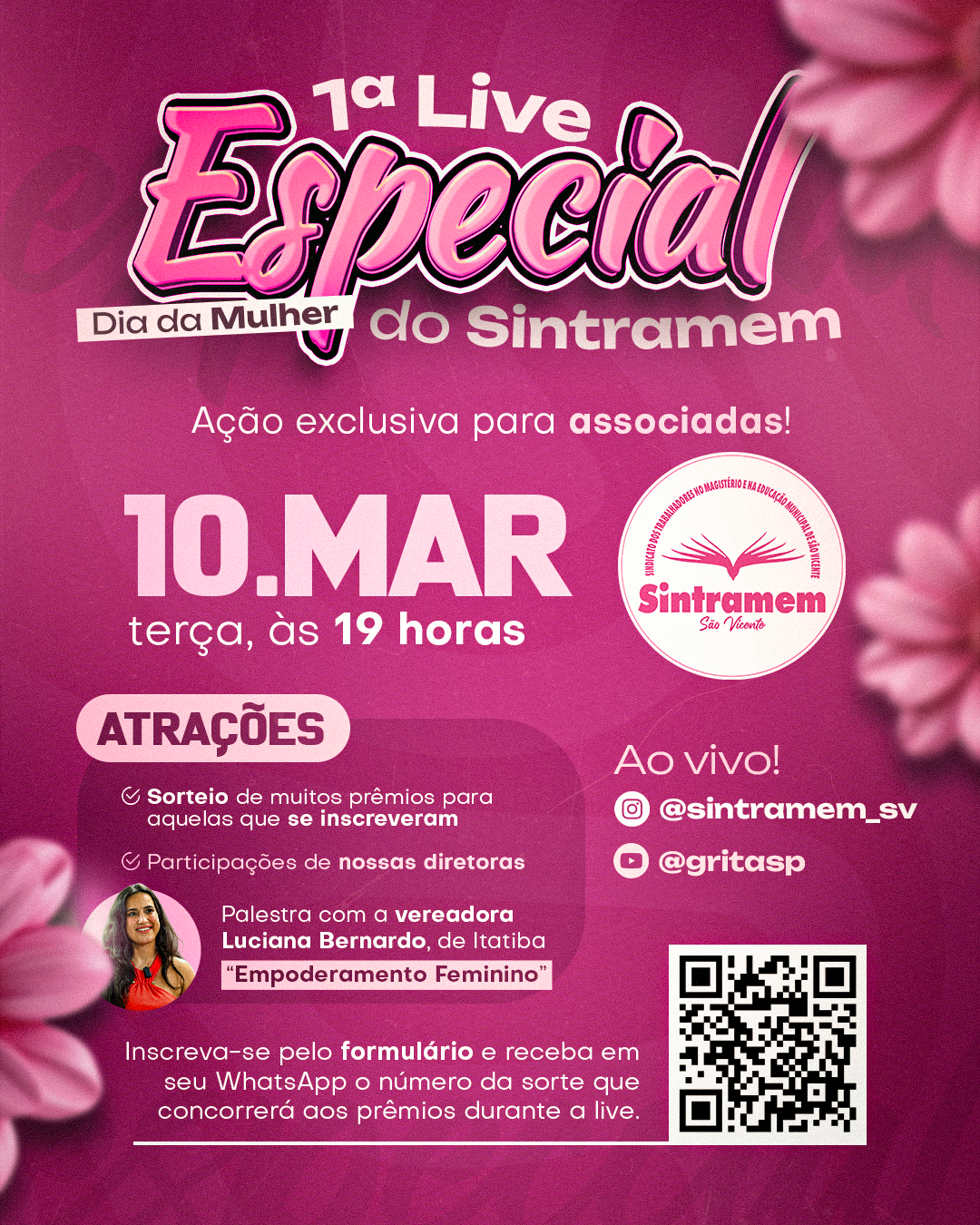 Além dos conteúdos formativos e inspiradores, a programação traz uma série de sorteios especiais, destinados às associadas previamente inscritas. A proposta é oferecer um momento de integração, acolhimento e reconhecimento às mulheres que compõem a base do SINTRAMEM e fortalecem a entidade.