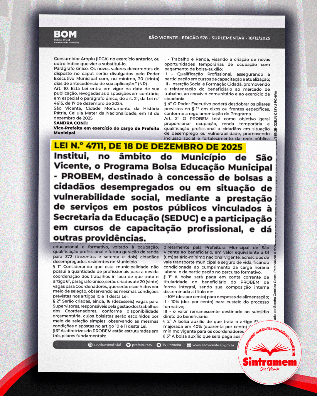 No final do ano, a Administração municipal aprovou a Lei Complementar nº 4.711/2025, que cria o Programa Bolsa Educação Municipal (PROBEM). A iniciativa prevê a concessão de bolsas-auxílio a cerca de 372 desempregados, vinculando-os a atividades em setores da Secretaria da Educação. A medida, no entanto, foi implementada sem um processo de debate prévio com entidades representativas, como o SINTRAMEM, ou com os conselhos da área. A ausência de diálogo levanta questionamentos: por que não houve espaço para debate sobre um projeto de tal porte?