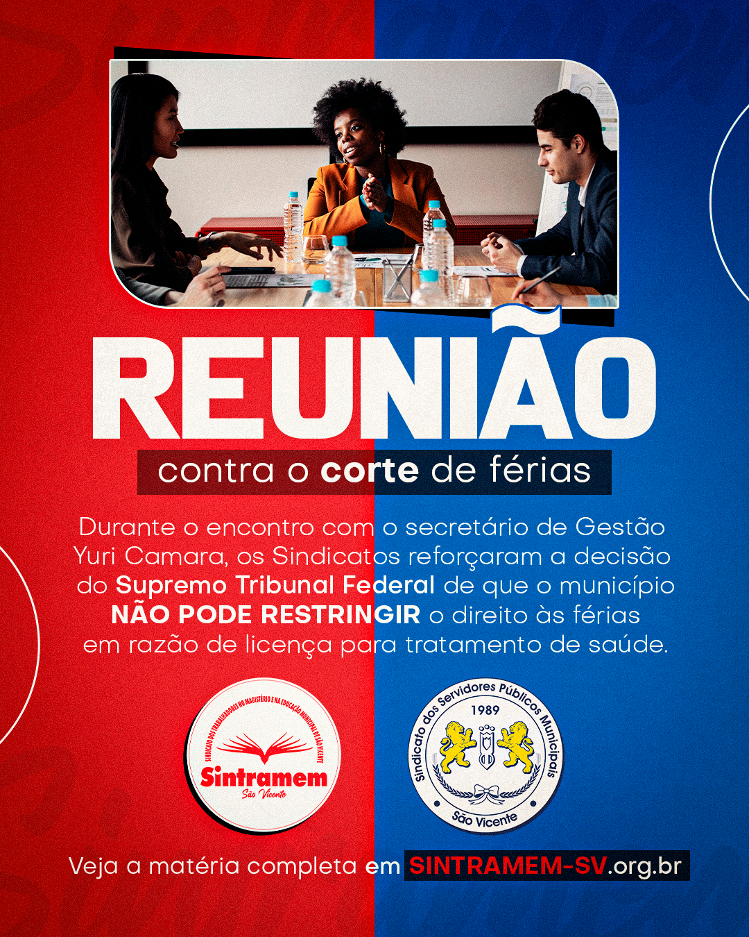 Diretores do SINTRAMEM e SindServSV estiveram reunidos na última quinta, dia 29 de janeiro, com o secretário Yuri Camara Batista, responsável pela secretaria de Gestão (SEGES), para tratar dos cortes no pagamento das férias dos Servidores públicos municipais de São Vicente. Na ocasião, durante a mesa de negociação, foi mencionada a súmula do Supremo Tribunal Federal (STF) que regulamenta a questão das férias nos casos de afastamento por licença médica.