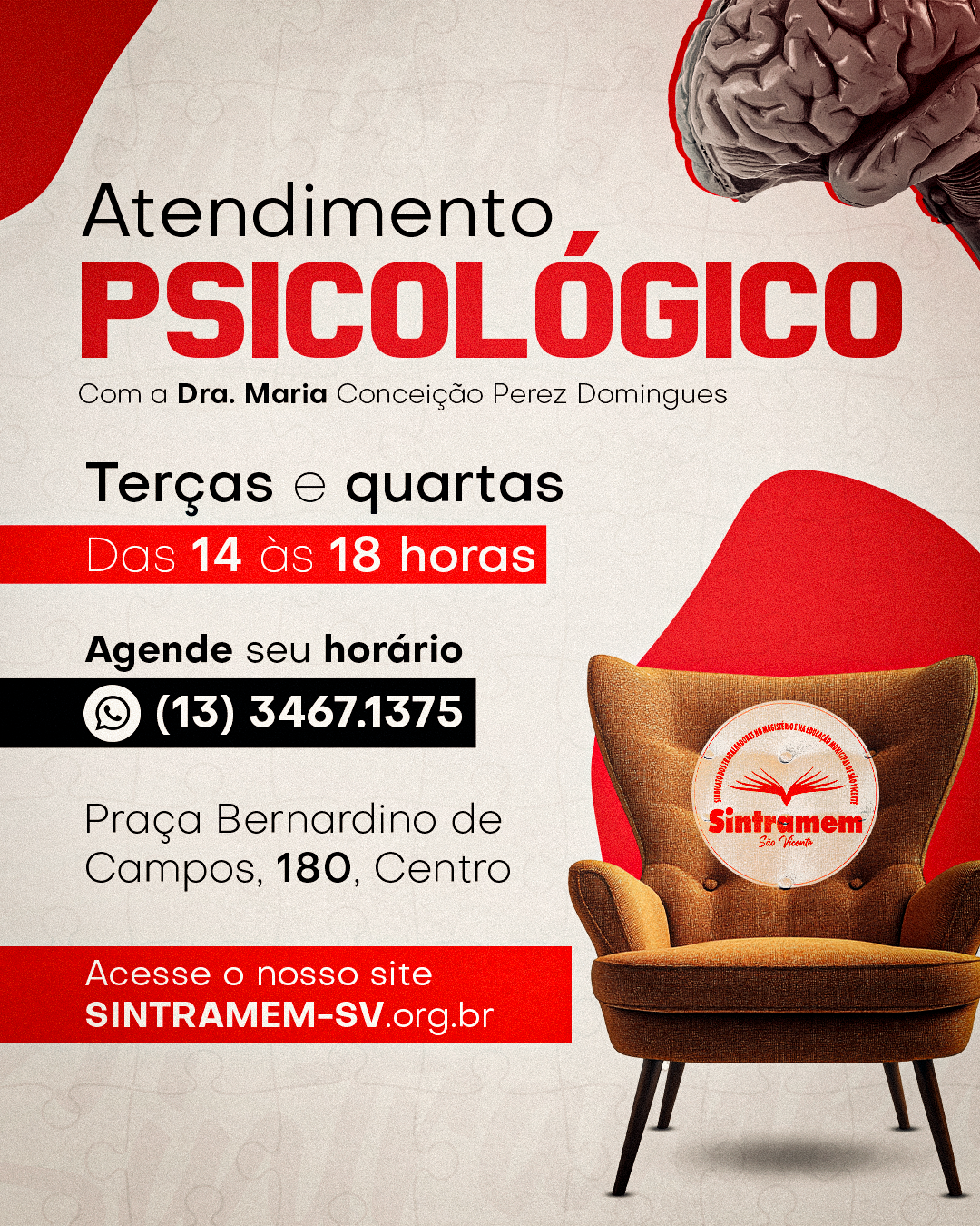 Os encontros presenciais com a Dra. Maria Conceição ocorrem todas as terças e quartas, das 14 às 18 horas, na sede do SINTRAMEM. O endereço é Praça Bernardino de Campos, 180, Centro. As vagas são preenchidas mediante contato pelo WhatsApp (13) 3467.1375 – e o sigilo profissional é assegurado em todas as etapas.