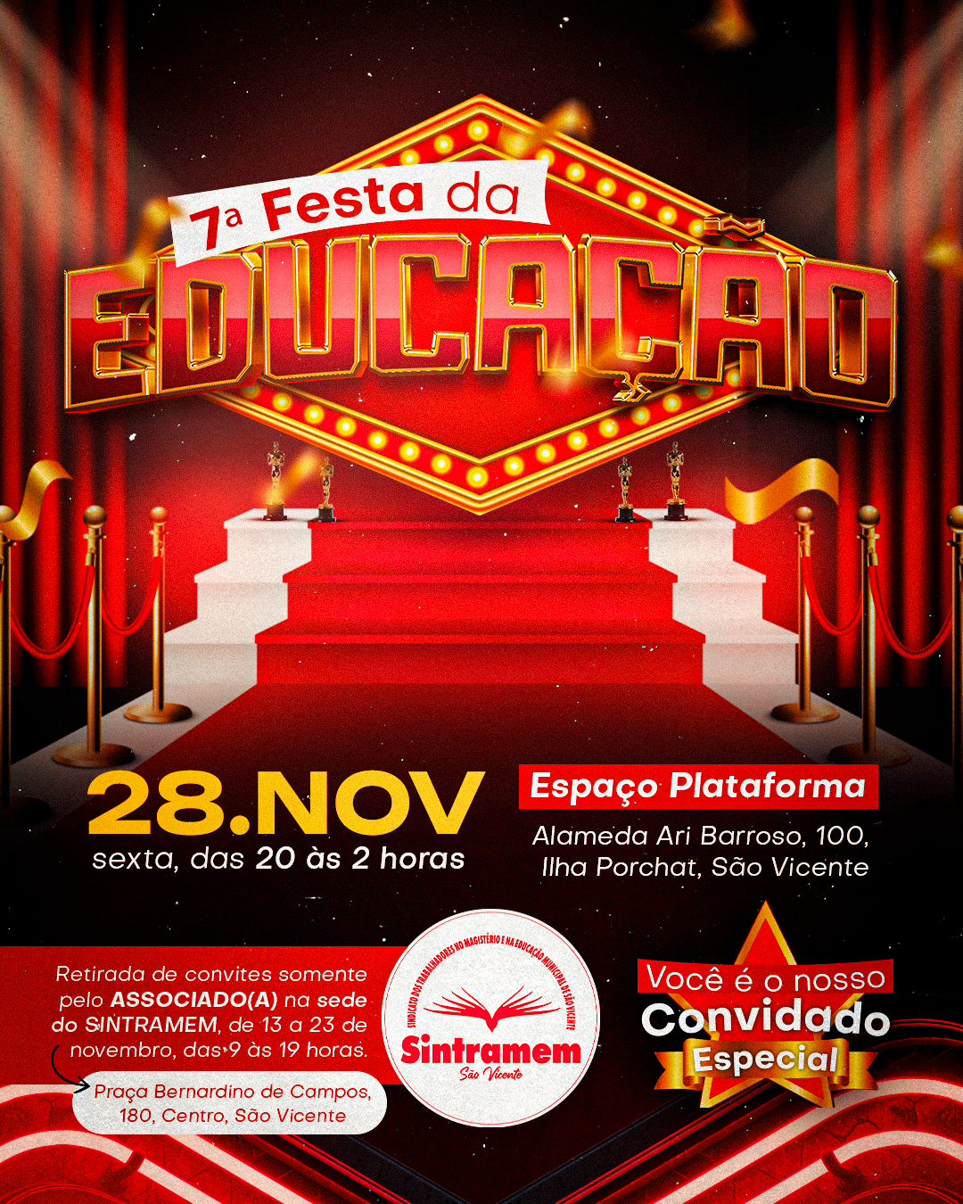 Depois de um ano marcado por intensas batalhas e constantes ataques ao Magistério e Profissionais da Educação, o Sindicato reafirma seu compromisso com a categoria, oferecendo um momento de celebração e união. Vem aí a 7ª Festa da Educação do SINTRAMEM! Será no dia 28 de novembro (sexta), das 20 às 2 horas da manhã, na Alameda Ari Barroso, 100, Ilha Porchat. Um evento EXCLUSIVO e GRATUITO aos nossos associados! É tempo de celebrarmos a força de quem luta todos os dias por uma Educação pública de qualidade em São Vicente.